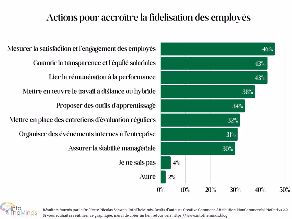 Commençons par les actions déjà en place dans les entreprises pour retenir leurs salariés. Ces actions peuvent être logiquement cumulatives, ce qui explique que le total soit supérieur à 100%. Un trio d’actions semble se dégager :