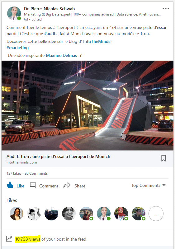 J’ai fait la capture d’écran ci-dessous le 15 mars à 11h et comme vous pouvez le voir, le post Linkedin avait déjà été vu 10753 fois. C’est mon meilleur score jusqu’à présent sur Linkedin.