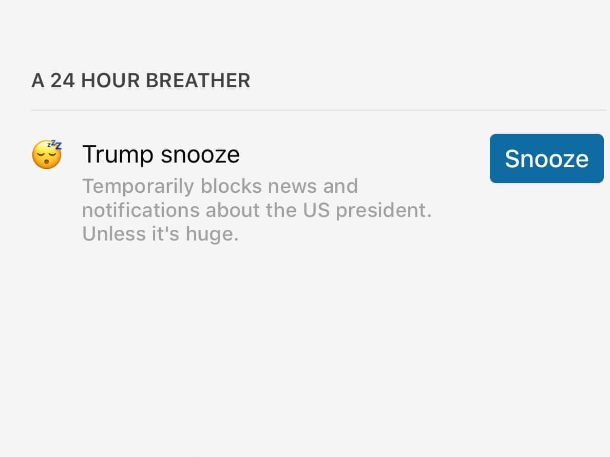 Au-delà de son interface l’application Qz.com possède également un mécanisme de feedback explicite étonnant que vous pourrez découvrir dans le panneau de configuration de l’application. Une fonction vous donne en effet la possibilité de mettre en sourdine (« snooze ») les informations sur Donald Trump pendant 24h. N’est-ce pas là une idée géniale ?