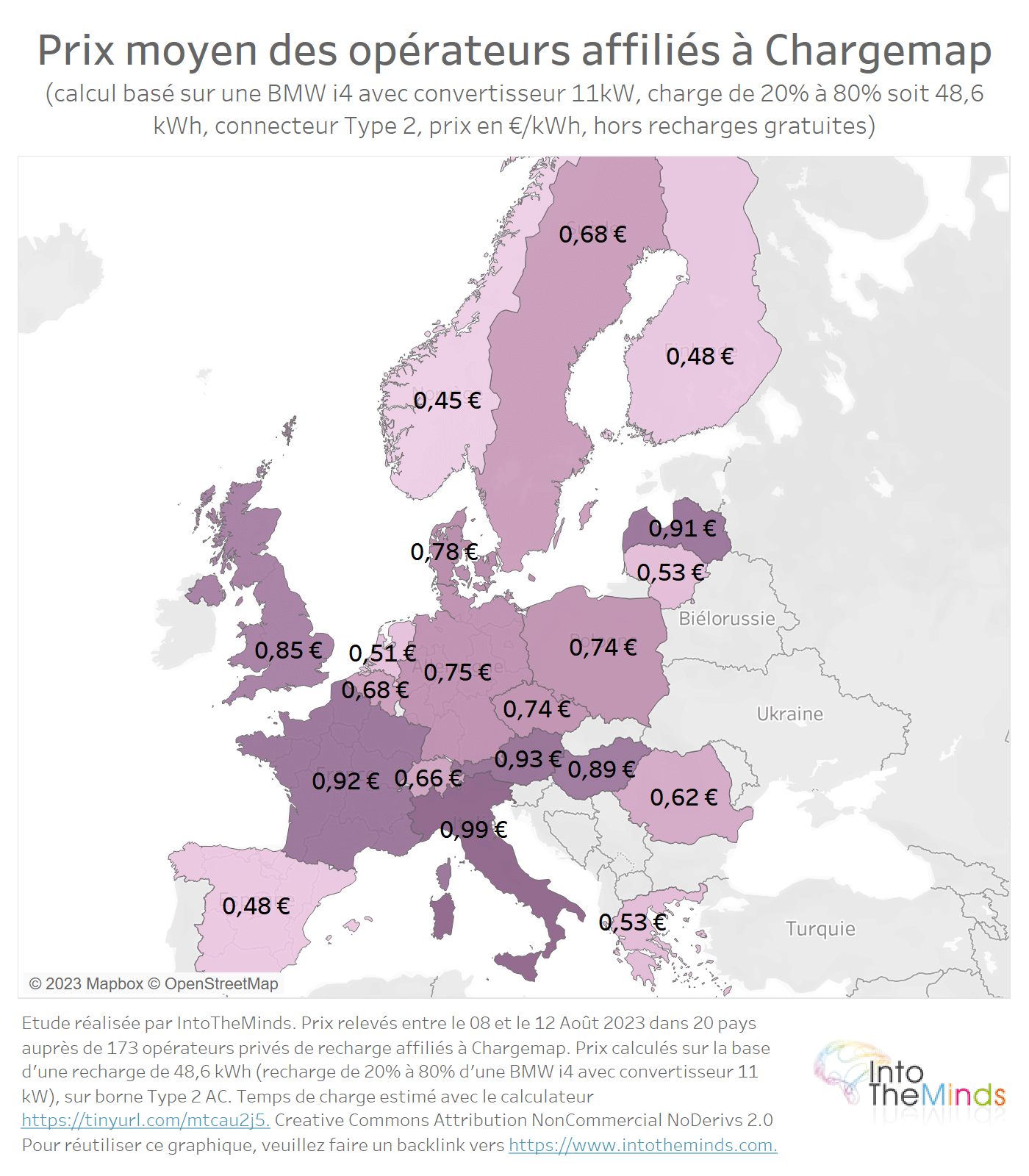 Sur la base d’une charge de 48,6 kWh, il est possible de calculer un prix moyen au kWh. Les surprises sont nombreuses. Dans le trio des pays les plus chers sur Chargemap on trouve donc l’Italie, l’Autriche et la France, dont les prix au kWh avoisinent 1€. Les causes sont sans doute différentes.