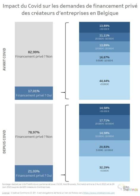 - Depuis la crise du Covid, en Belgique, les créateurs d’entreprises font moins appel aux aides publiques (-10 points) et plus au financement privé (+4 points). La proportion d’aides publiques inférieures à 5000€ a doublé (+29 points), alors que celles de moins de 5000€ dans le financement privé a diminué de 14 points.