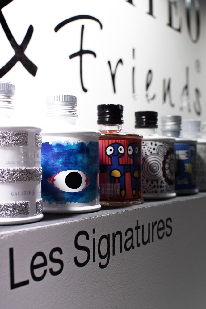 Galateo & Friends bietet eine Reihe von Olivenölen an, die an ihren gehobenen Flaschen erkennbar sind. Ihre Linie “Les signatures” spiegelt den Marketingansatz von Château Mouton-Rothschild wider: Jedes Jahr wird die Flasche von einem anderen Künstler signiert oder ist das Ergebnis einer anderen Zusammenarbeit. Es handelt sich um eine permanente Co-Branding-Aktion, die Teil des Marketing-Mix der Marke ist. Die von dem Designer Carlo Volpi signierten Flaschen gibt es zum Beispiel in 4 verschiedenen Versionen, die in einer Schachtel verkauft werden.