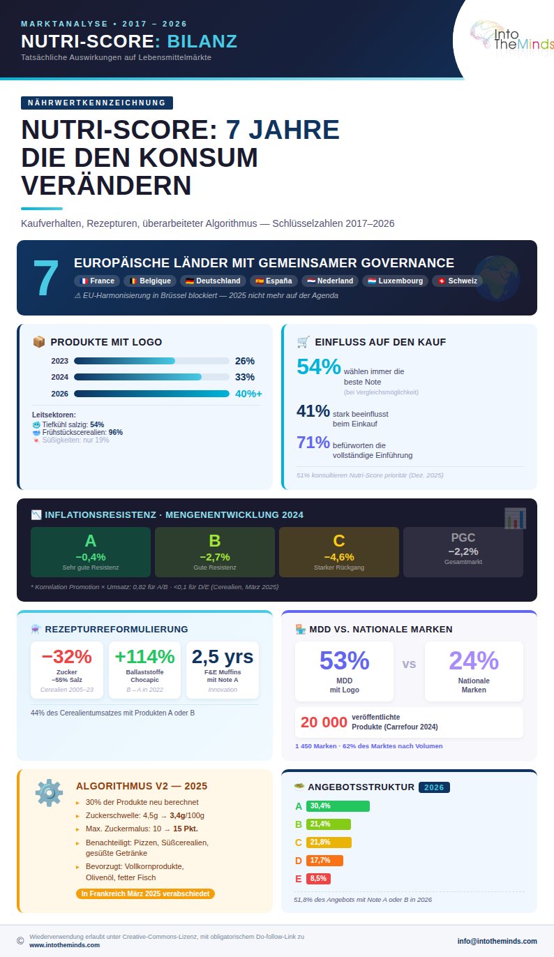 Seit seiner Einführung sorgt der Nutri-Score für viel Diskussion, und die jüngste Überarbeitung der Berechnungsmethode hat die Situation nicht gerade beruhigt. Der Nutri-Score bewertet die ernährungsphysiologische Qualität von Lebensmitteln von A bis E und spaltet ebenso sehr, wie er überzeugt. Doch jenseits der Kontroversen widmet sich dieser Artikel einer zentralen Frage: Verändert dieses System der Nährwertkennzeichnung tatsächlich unsere Konsumgewohnheiten? Wir haben zahlreiche Umfragen zu diesem Thema in verschiedenen Ländern durchgeführt, und die Ergebnisse verdienen es, anhand von Marktdaten differenziert betrachtet zu werden. Genau das schlage ich Ihnen in diesem Artikel vor – ergänzt durch eine Infografik, die ich auf Basis der aktuellsten verfügbaren Daten erstellt habe.