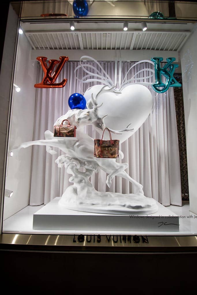 - Die Ballons in den 2 Ecken des Schaufensters: Beachten Sie, wie die Initialen von Jeff Koons mit dem Logo von Louis Vuitton gleichgesetzt werden