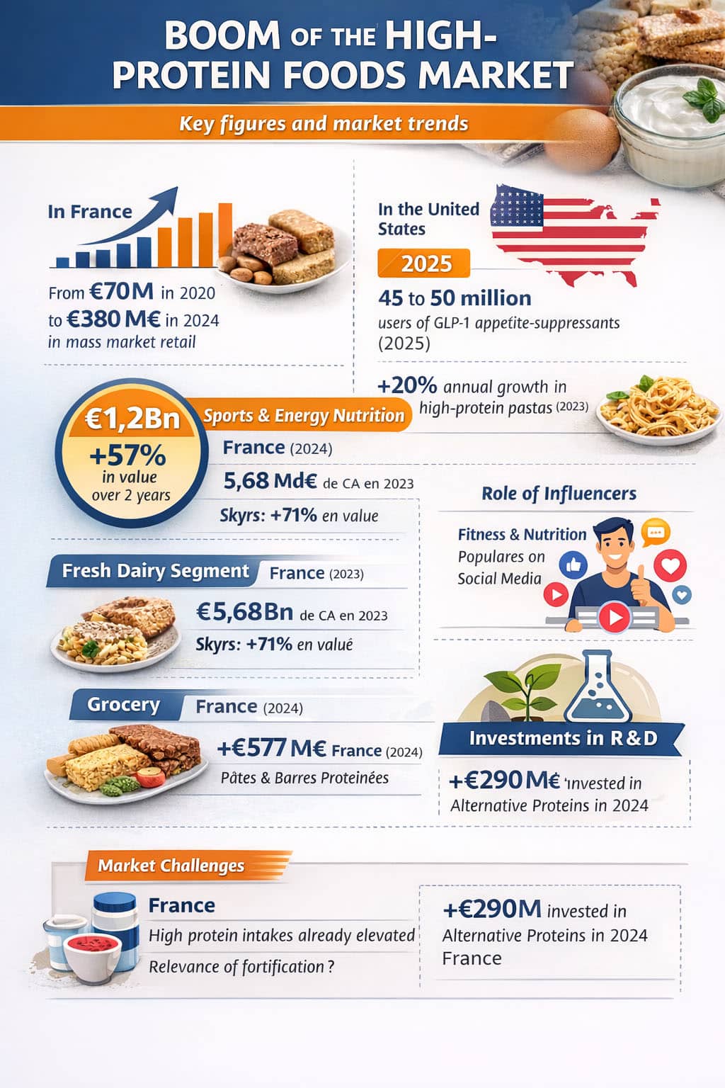 Der französische Markt für proteinreiche Lebensmittel in Supermärkten repräsentiert im Jahr 2024 mehr als 380 Millionen Euro, verglichen mit etwa 70 Millionen Euro im Jahr 2020. Dieses spektakuläre Wachstum von über 400% in vier Jahren spiegelt eine anhaltende Begeisterung für diese Produkte wider. Funktionelle Sport-/Energieernährung im weiteren Sinne macht 1,2 Milliarden Euro aus.