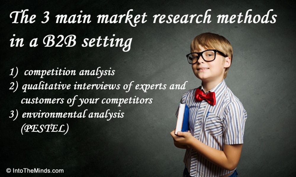 Der Zweck dieses Absatzes ist es, Ihnen die 3 wesentlichen Methoden der B2B-Marktforschung vorzustellen. Es geht also nicht darum, erschöpfend zu sein ( wir verweisen Sie hierzu auf unseren Online-Leitfaden), sondern vielmehr die effektivsten und am wenigsten kostspieligen Methoden zu berücksichtigen. Dieser Abschnitt richtet sich daher in erster Linie an Existenzgründer und Projektleiter, die die Machbarkeit und Relevanz ihres Projekts anhand von Sachdaten und realistischen Marktanalysen überprüfen müssen. Die 3 ausgewählten Methoden sind das Ergebnis von 15 Jahren Praxis in unserer Firma und mehr als 100 durchgeführten Projekten im B2B-Bereich.