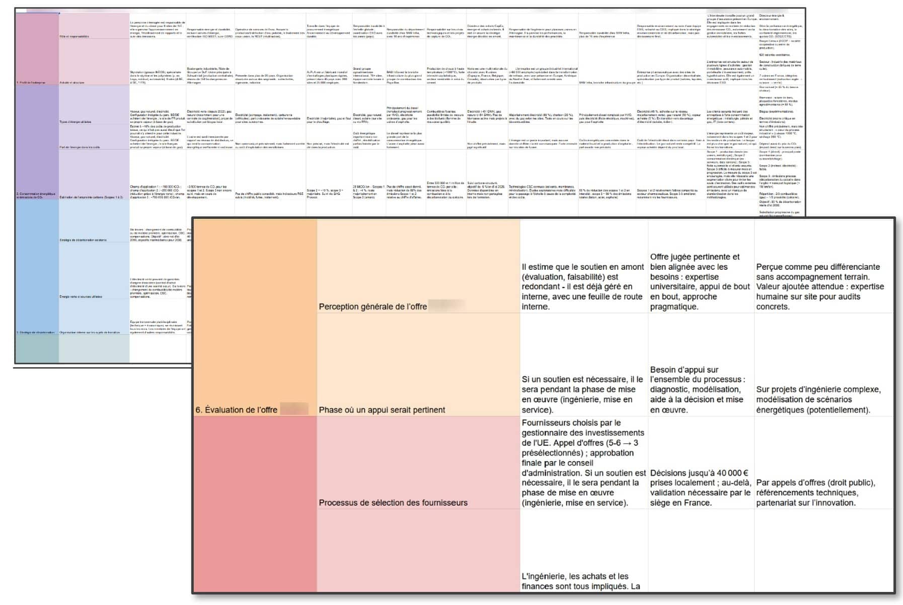 Wenn Ihr Pflichtenheft eine Marktforschungsstudie mit einer qualitativen Methode betrifft, kann es interessant sein, festzulegen, wie die Analyse der Interviews dokumentiert werden soll. Dies ermöglicht Ihnen auch, das Format der Zwischenergebnisse zu spezifizieren. Bei IntoTheMinds analysieren wir sowohl qualitative Interviews als auch Fokusgruppen mit Hilfe einer Tabelle, die die Themen und Unterthemen (die Zeilen) und die Befragten (die Spalten) detailliert. Dieses Ergebnis, das intern verwendet wird, wird dem Kunden am Ende der Mission ebenfalls übergeben.