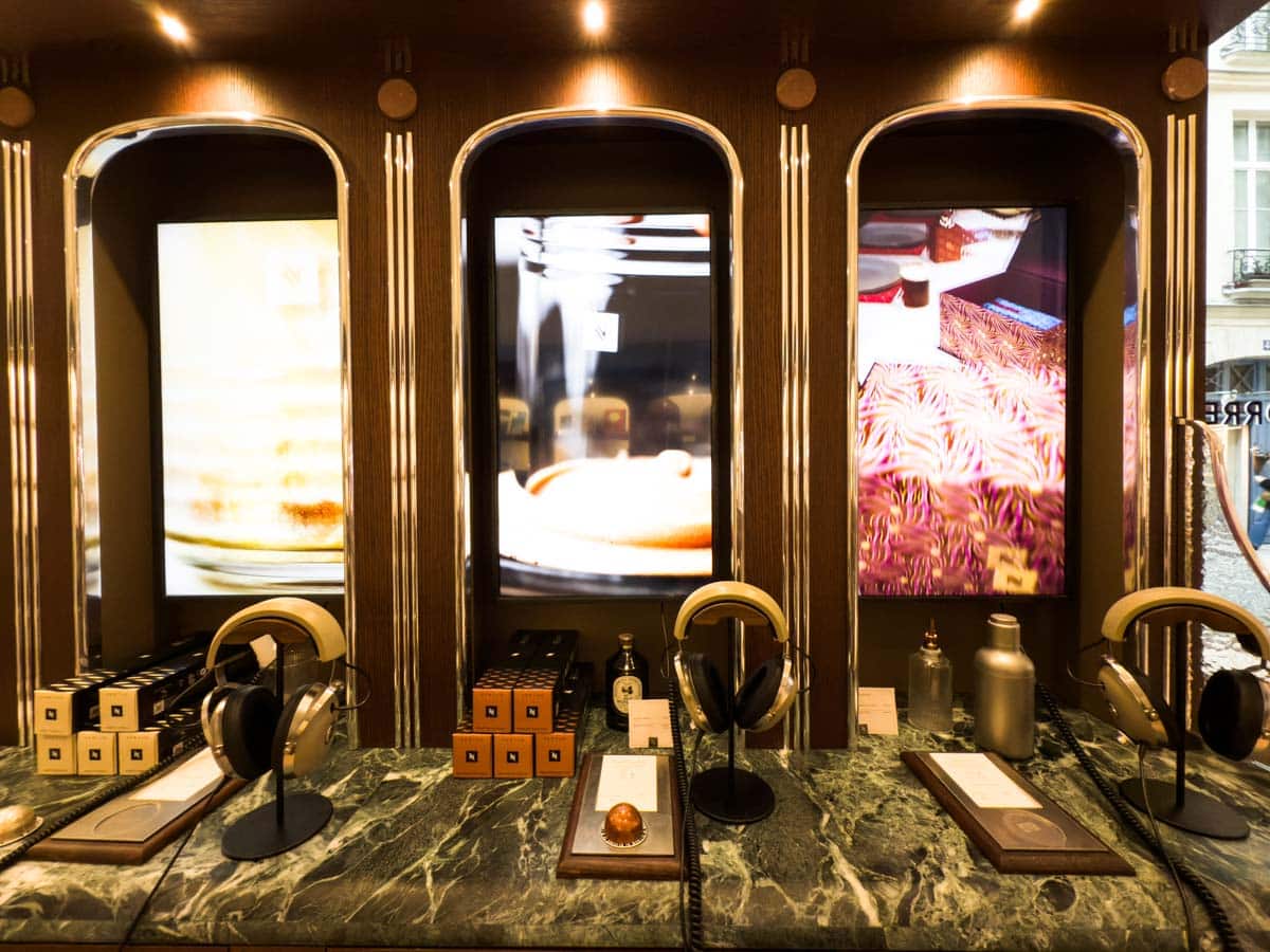 Die Maison Nespresso ist ein neues Konzept, das im Oktober 2025 von Nespresso im historischen Marais-Viertel in Paris eröffnet wurde (Adresse: 47, rue Vieille du Temple, 75001 Paris). Es ist ein hybrider Ort, der eine Premium-Erfahrung rund um Kaffee anbietet. Auf diesem Foto (das ich am 22. Dezember 2025 aufgenommen habe), sehen Sie verschiedene Geräte, die die Kundenerfahrung verbessern: Kopfhörer, um Atmosphären zu jedem Kaffee zu hören, olfaktorische Geräte, um die Nuancen jedes Kaffees zu schätzen. Die Verwendung von grünem Marmor, dunklem Holz, trägt zu dieser Upscale-Positionierung bei.
