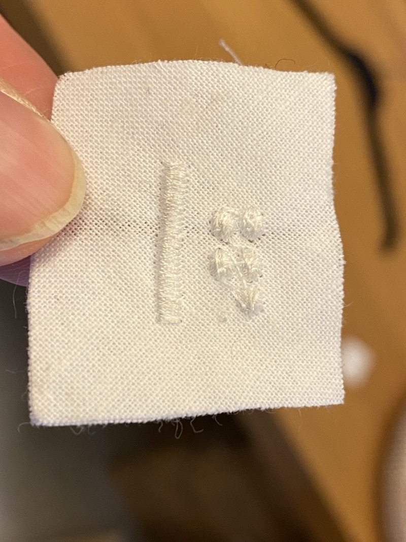 Die erste Innovation sind gestickte Etiketten in Blindenschrift. Der Verein schlägt vor, ein Wort oder einen kurzen Satz auf Etiketten zu sticken, die dann in die Kleidung eingenäht werden. Am Tag unseres Besuchs wurde ein Befehl für ein Mitglied realisiert, das einen Code aufgestickt haben wollte, um seine Kleidung zu erkennen.