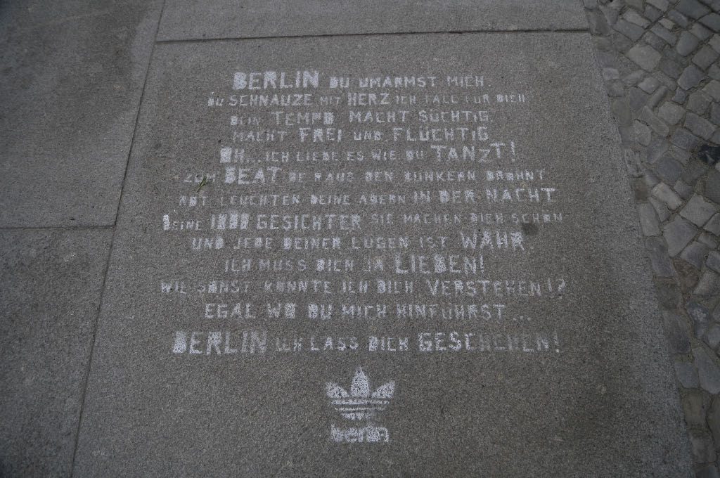 Est-ce Adidas qui a utilisé des graffitis peints au sol pour attirer l’attention des piétons sur son magasin tout proche (Münzstrasse) ? Pas si sûr … Si l’idée en soi est bonne on peut toutefois s’interroger sur son caractère légal (le graffiti à base de peinture représentant quand même une dégradation de l’environnement urbain). Cela ressemble donc plus à un acte « artistique » sauvage qui aurait eu le hasard d’apparaître à proximité immédiate d’un flagship store de la marque.