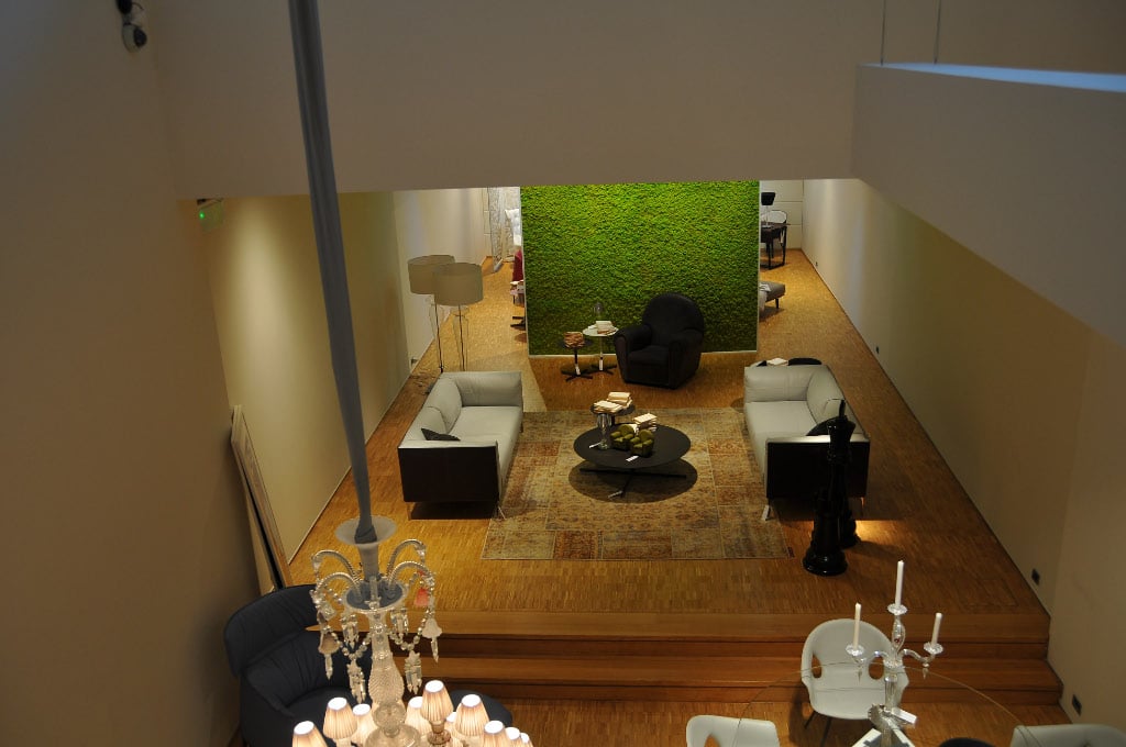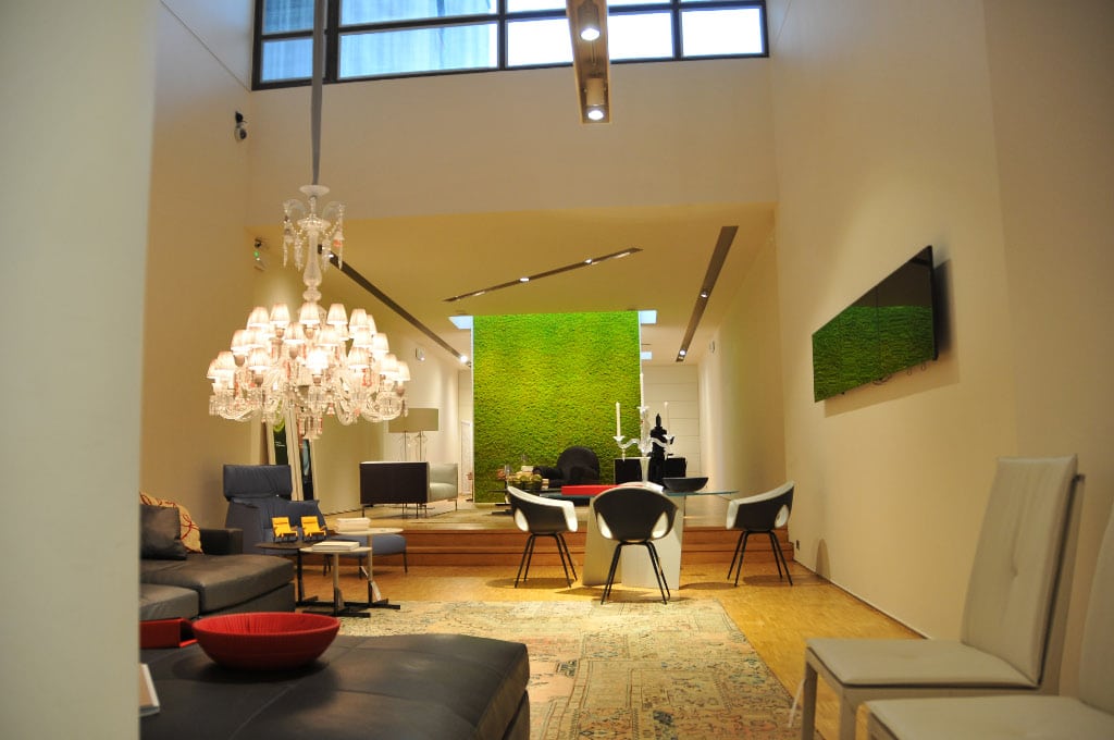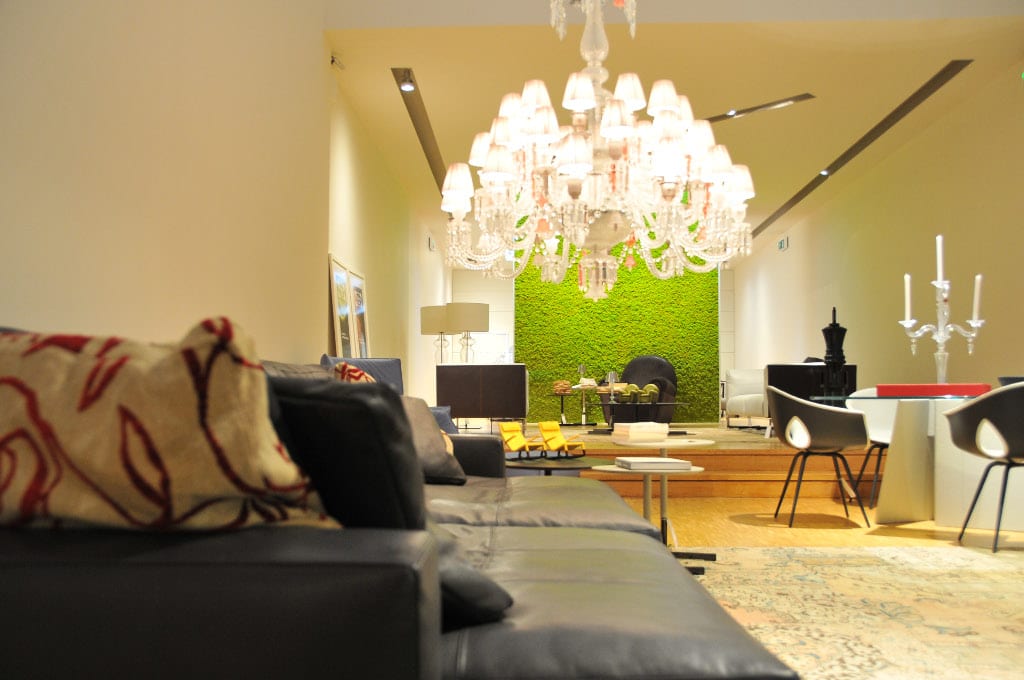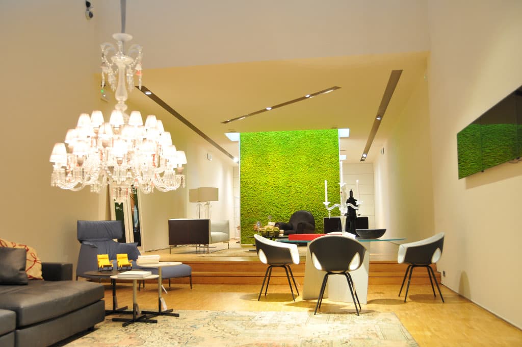 Nous sommes tombés sur un autre exemple à Bruxelles, dans l’ancien showroom Dominique Rigo récemment reconverti en point de vente Poltrona Frau (qui s’est d’ailleurs associé avec Baccarat pour l’occasion). Le point de vente a repris les codes architecturaux des autres magasins Poltrona Frau et incluse donc un mur végétal, bien planté au milieu du point de vente.