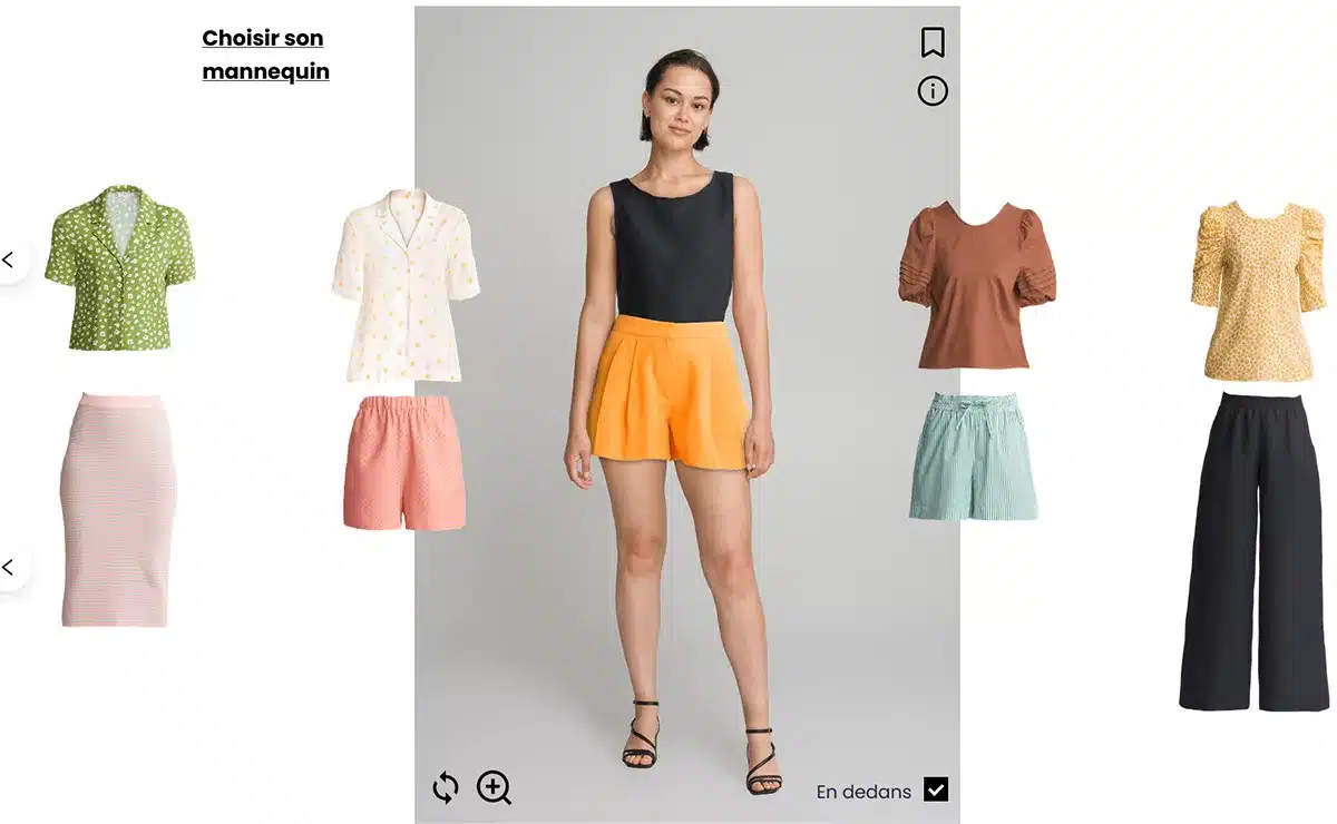Dans l’e-commerce les applications sont nombreuses et des exemples concrets sont déjà visibles sur les sites de grands retailers. Sur le site de l’entreprise française La Redoute par exemple, il est possible de visualiser des vêtements de son choix et de créer des looks sur des mannequins virtuels. Plusieurs mannequins sont disponibles qui peuvent être choisis en fonction de sa morphologie (voir capture d’écran ci-dessous).