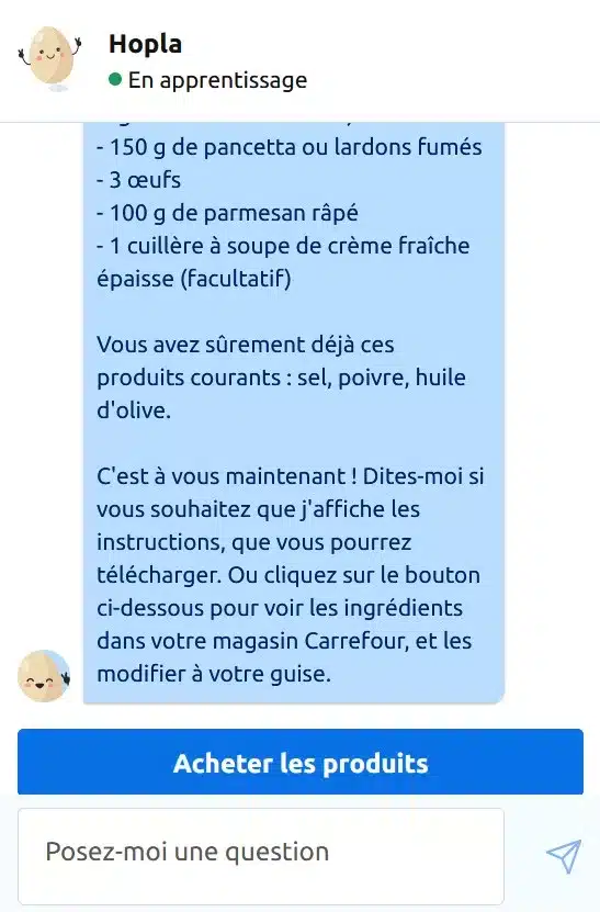 A quelques jours d’intervalle, Carrefour lança son chatbot Hopla qui concrétisait la vision que je défendais. Il devenait possible d’être conseillé de manière personnalisée, de demander toutes les modifications possibles en langage naturel et de passer sans effort à la mise en panier et à la commande. C’était une vraie révolution.