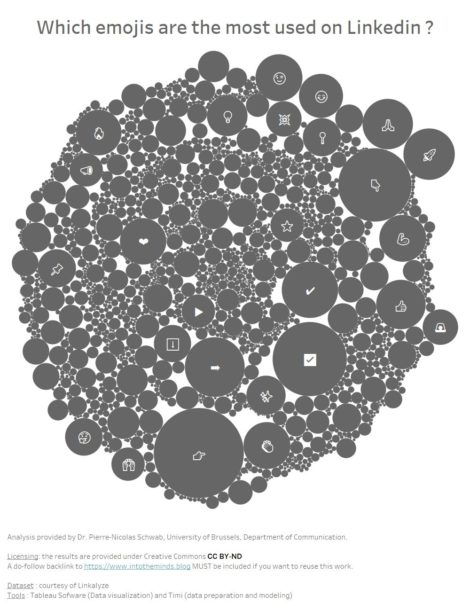 2,932 millions d’émojis ont été extraits de 4,6 millions de posts Linkedin dans 30 langues et dans 183 pays. Une expression Regex a été utilisée (merci Frank !) que j’ai décrite dans ce post. Les visualisations ont été réalisées sous Tableau.