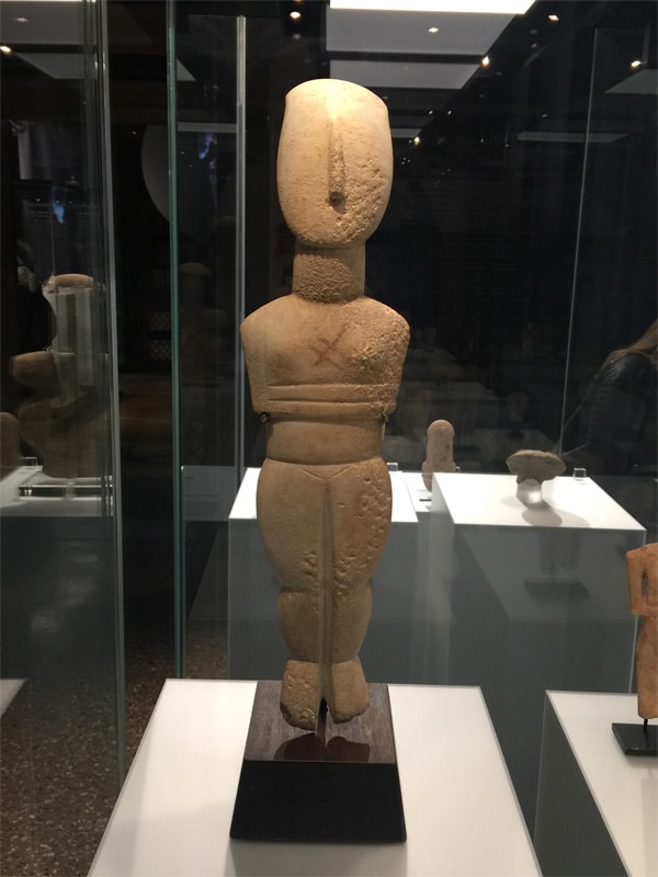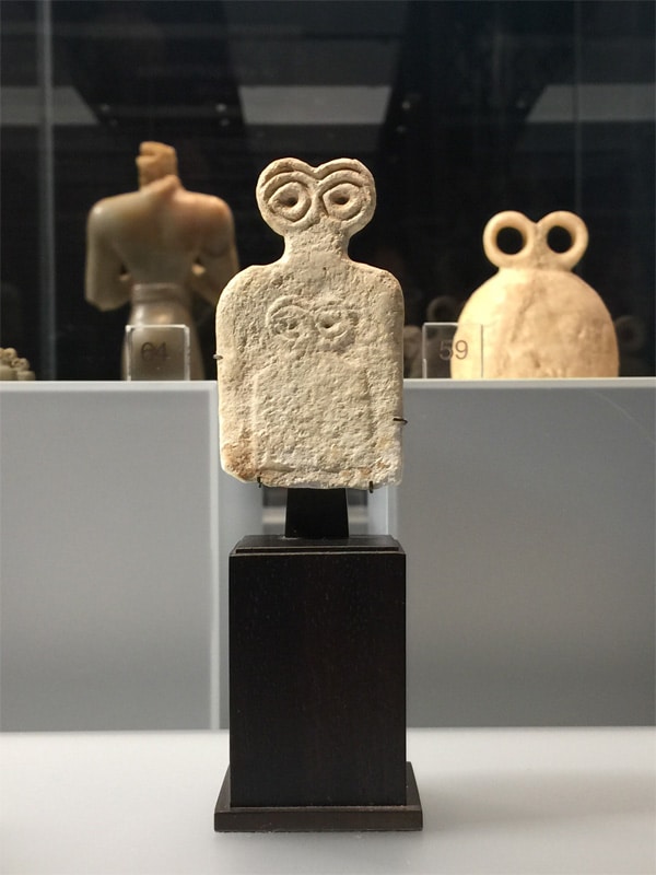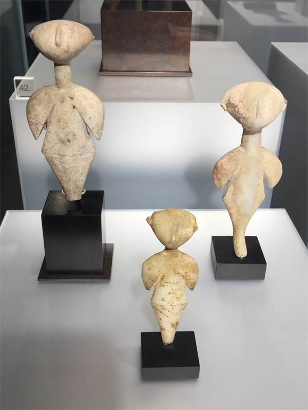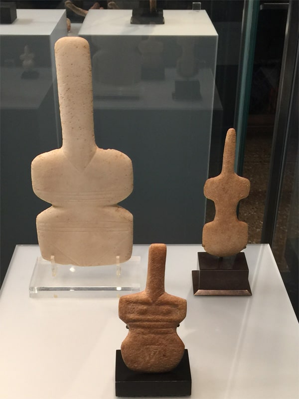 From left to right: violin figures (Cycladic Islands, 3300-2700 BC), idol (Cycladic Islands, 3300-2700 BC), Tipo Kilia figures (Western Anatolia, 3300-300 BC), Spectacled Idol (Western Asia, 3300-3000 BC)