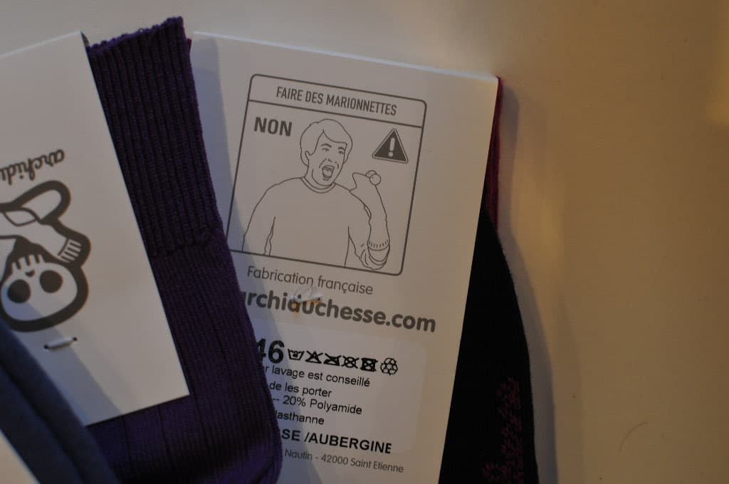 The offline execution, was excellent. The parcel was on time (obviously ; you can’t create a positive experience if your supply chain is defective), the socks were wrapped in tissue paper and closed by a branded sticker. I even found some goodies in the parcel (two bigger stickers and candies) which, although inexpensive, reinforce the sympathetic side of the brand. Last but not least, the label on the socks themselves is interesting. It features a funny message (see pictures below).