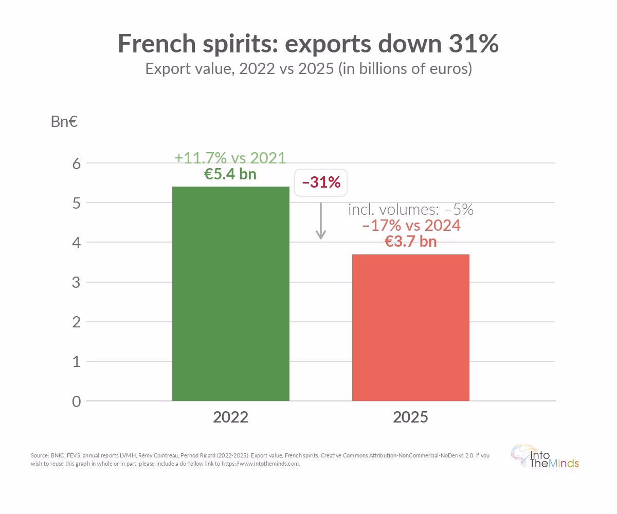 The Chinese market was heavily impacted in 2025. The anti-dumping investigation targeting European spirits led to a 30% drop in shipments. Direct exports of French wines and spirits to China fell to €767 million, a decrease of 20% compared to 2024.