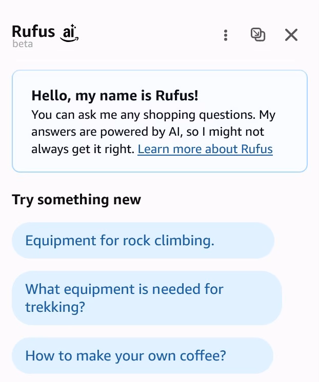 The second type groups AI integrated into merchant sites. They are designed to improve the customer experience on the site and optimise conversion. These are shopping assistants, recommendation engines or intelligent searches integrated directly into the site. Amazon, Zalando or Otto rely on these technologies to guide the customer. Amazon’s assistant is called Rufus (see below) and you will note that it has been given a first name to anthropomorphise it. In other words, we seek to make these assistants “human”.