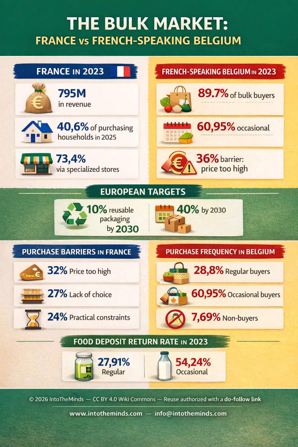 French-speaking Belgium presents a radically different profile. In 2023, only 7.69% of respondents reported never purchasing bulk products, compared to 28.8% regular buyers and 60.95% occasional buyers. This exceptional penetration is explained by a broader definition of bulk.