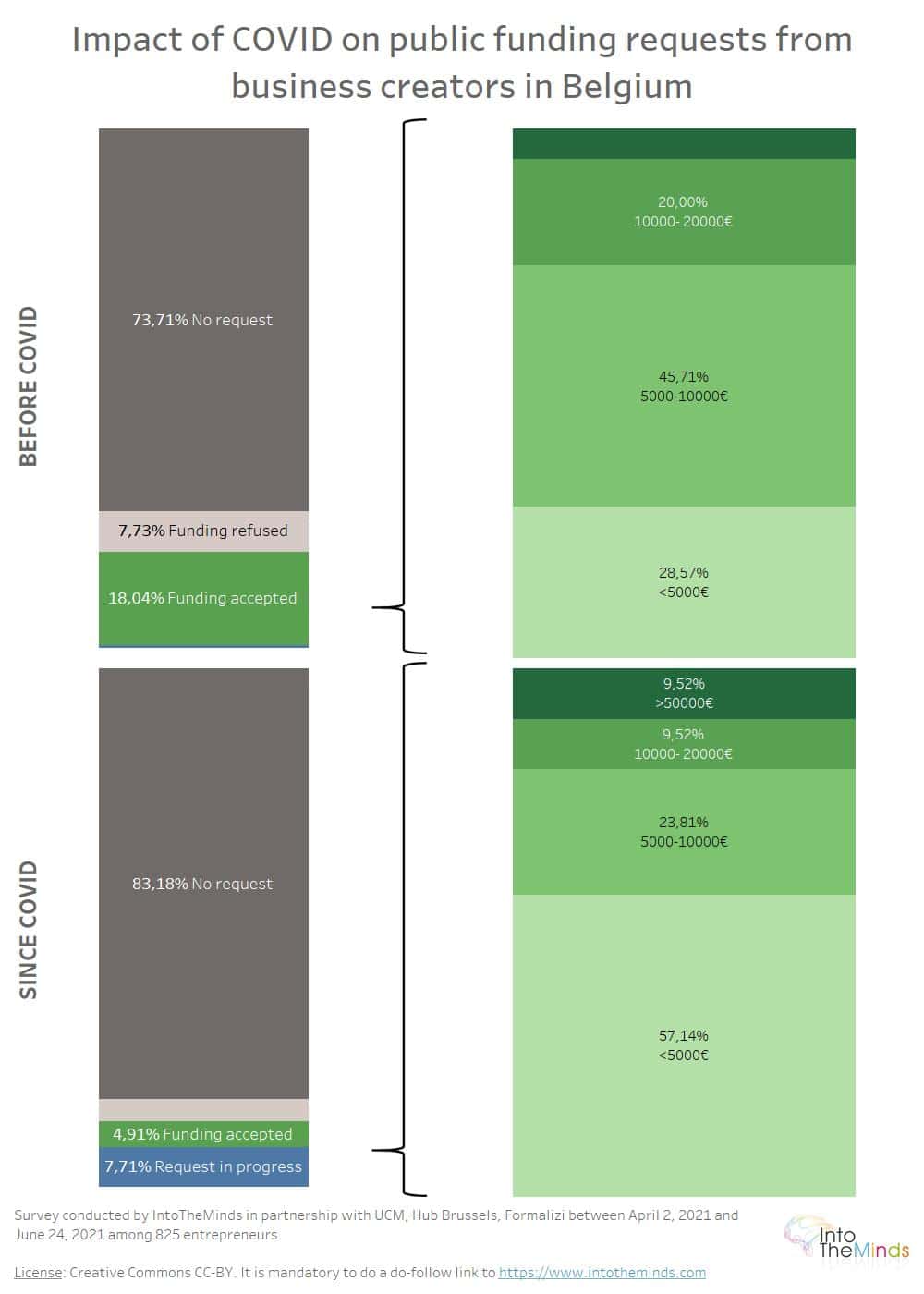 - Since the Covid crisis, business creators in Belgium have been relying less on public aid (-10 points) and more on private financing (+4 points). The proportion of public assistance under €5000 has doubled (+29 points), while private funding under €5000 has decreased by 14 points.