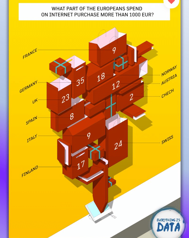 First, there’s the use of 3D (again and again 😫). Then there’s the arrangement of what I believe to be “gift packages.” Then, there are obvious errors in data representation: the size is not proportional to the data visualized. In short, everything is wrong.