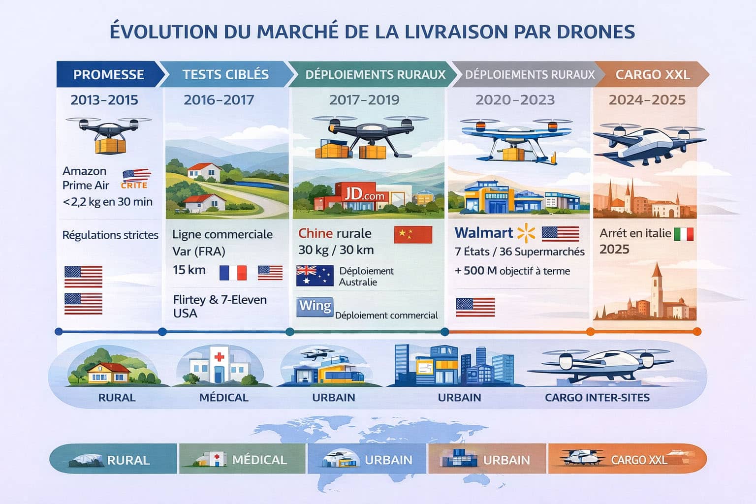 The modern history of drone delivery truly began on December 2, 2013 in the U.S., when Amazon unveiled Prime Air. The company set a clear ambition: to deliver packages up to 2.2 kg in under 30 minutes, representing 86% of its shipments. This attractive commercial promise quickly faced civil aviation constraints. The presentation video of the time (see below) was very ambitious and awakened minds to an important innovation for “last mile” coverage. Strategically, Prime Air helps make the entire logistics chain more autonomous, from delivery to in-store product availability with Amazon Go.