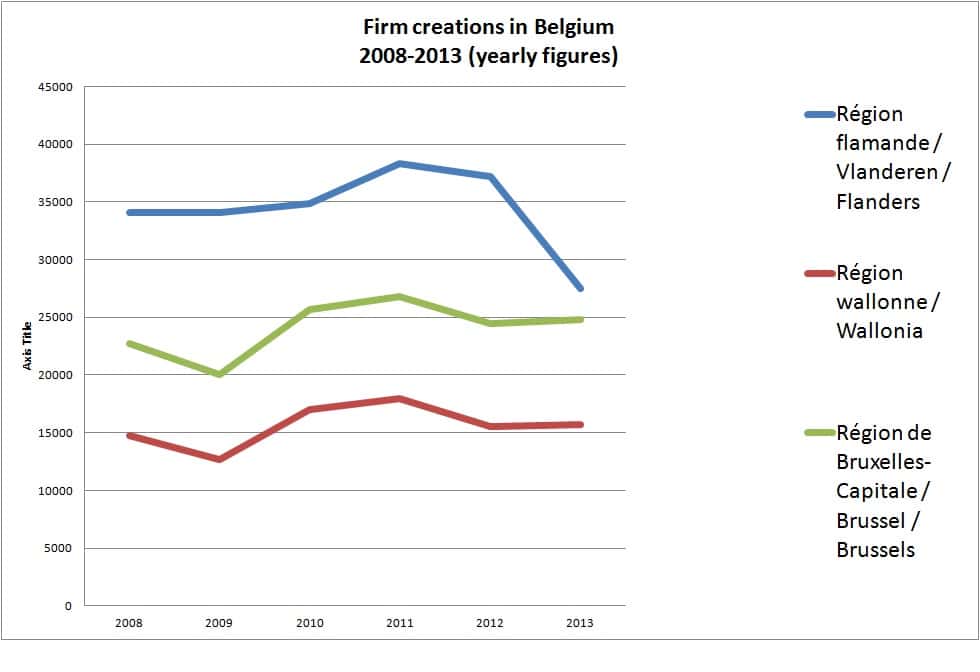 If you look at the yearly graphs we compiled for you, you can see first of all that 2013 was indeed a really bad year in Flanders where the number of firm creations plunged. It remained stable in Brussels and Wallonia after a slight decline in 2012.