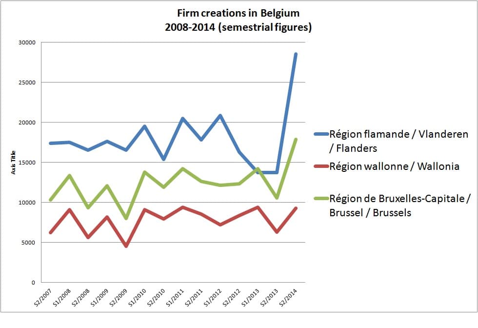 In this article La Libre announced in particular that firm creation had decreased 11.3% in Wallonia whereas in increased 2.14% in Flanders and remained stable in Brussels (article in French).