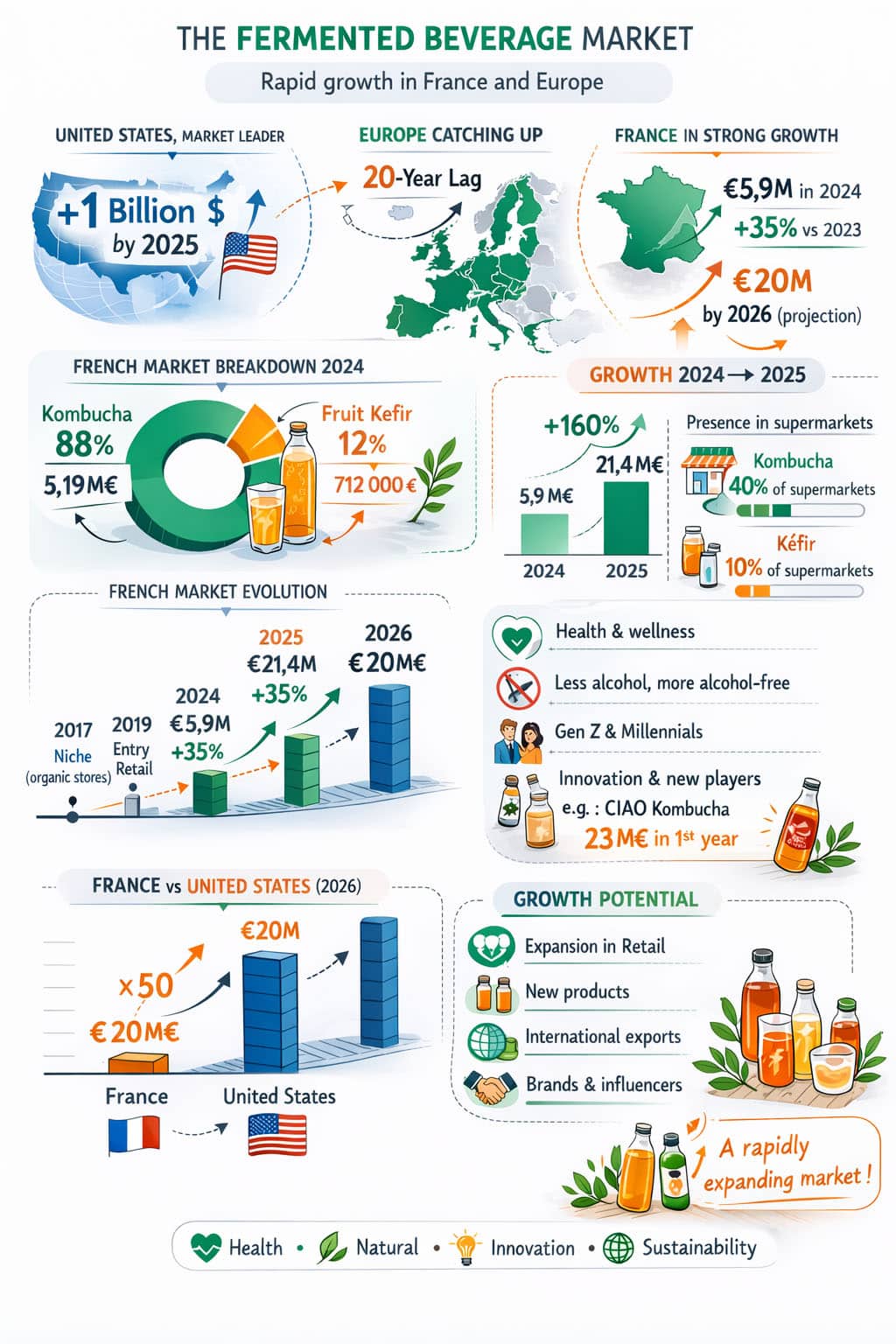 In 2024, the French fermented beverages market represents €5.9 million in revenue, with 35% growth compared with 2023. In mass retail specifically, this figure reached €21.4 million in 2025, representing a 160% increase.