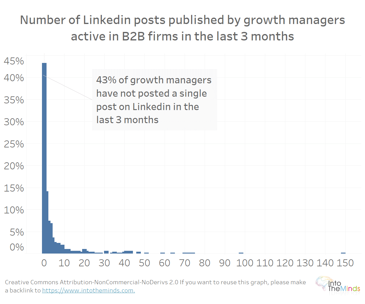 There’s little doubt that LinkedIn is THE social network to use when you’re active in B2B. Everyone is trying to understand the secrets of LinkedIn’s algorithm to be the most visible. Yet our research into the LinkedIn activity of 503 B2B growth managers shows that 43% have not posted anything in the last 3 months. Therefore, the results we reveal in this article are surprising coming from professionals who are supposed to be responsible for their company’s growth.