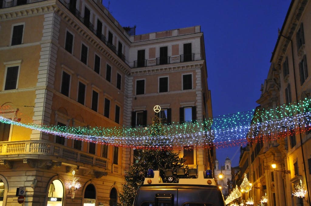 The main attraction was however to see in Via Condotti, a street parallel to Via Frattina (click here if you to see what the street looks likes in the early morning). Via Condotti was owned by Mercedes (or should I say Daimler) which had even decorated the Christmas Tree with its emblem. Mercedes made a partnership with the association of the representatives of the street. In terms of visibility one must admit that it’s very well done; Via Condotti is indeed not only attracting people around Christmas but also on Dec. 8th, the day of the celebration of the Immaculate Conception dogma, when the pope himself walks up the street.
