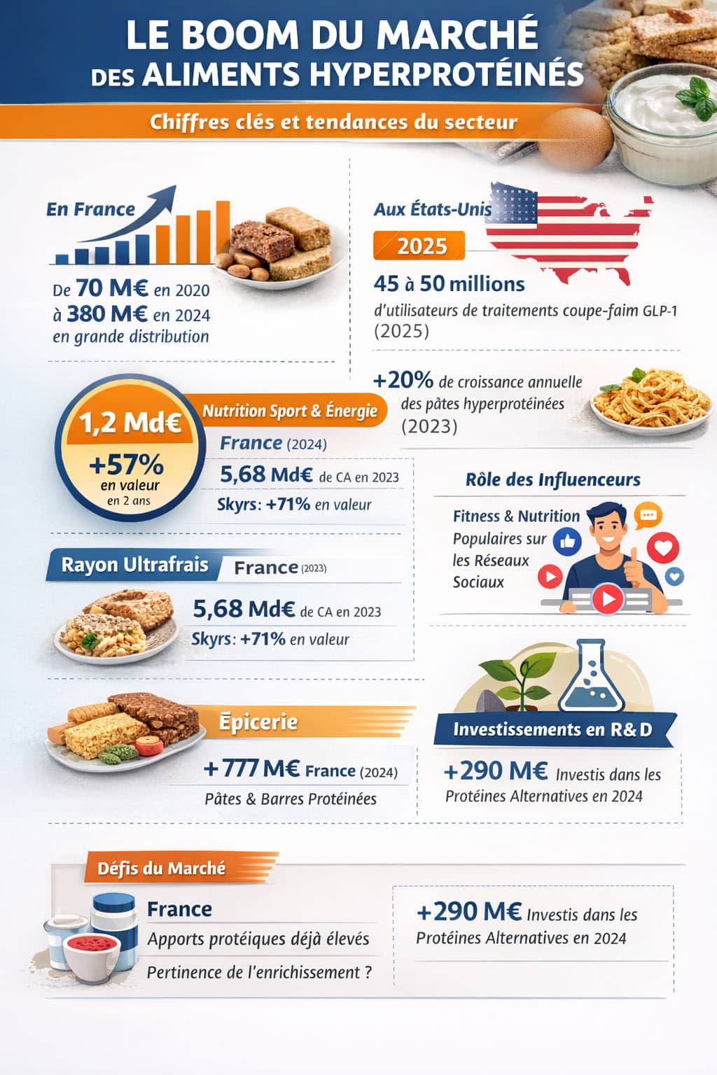 The French high-protein food market in supermarkets represents over 380 million euros in 2024, compared to approximately 70 million euros in 2020. This spectacular growth of over 400% in four years reflects enduring enthusiasm for these products. Functional sports/energy nutrition broadly accounts for 1.2 billion euros.