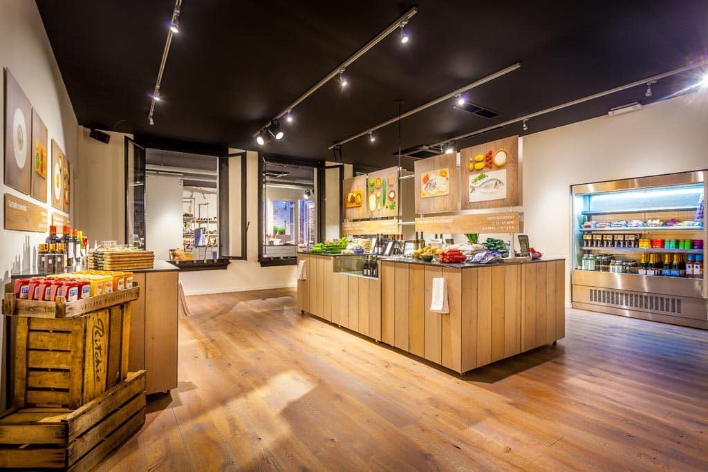 Black ceiling, direct lights, white walls and a lot of space make the experience refreshing for the client. You’ re NOT in a supermarket; the large alleys will enable you to feel at ease when choosing what you want to eat for dinner. Thierry has tried to reengineer all touchpoints so that they are at the opposite of those of a supermarket.