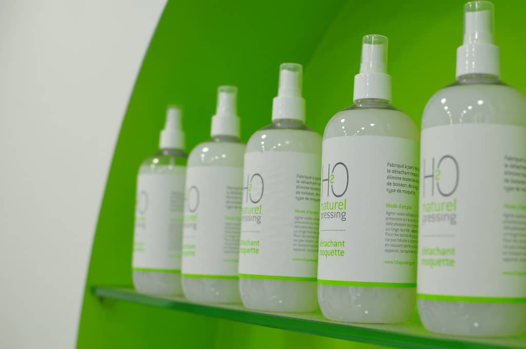 As you will see on the pictures below, an amazing work was done on the layout of the store and on the graphical elements used. Although the budget was pretty limited to renovate the sales point, clever solutions were found to reinvent the space and rejuvenate the customer experience. Besides the colors which convey the organic and the freshness attributes, you’ll notice that the shop is divided into two distinct spaces (which is not the case in traditional dry cleaners): the counter is completely separated from the cleaning are. Next time you go to a traditional dry cleaner you’ll notice that those two areas are usually not separated which gives dry cleaner stores an uncleaned appearance.