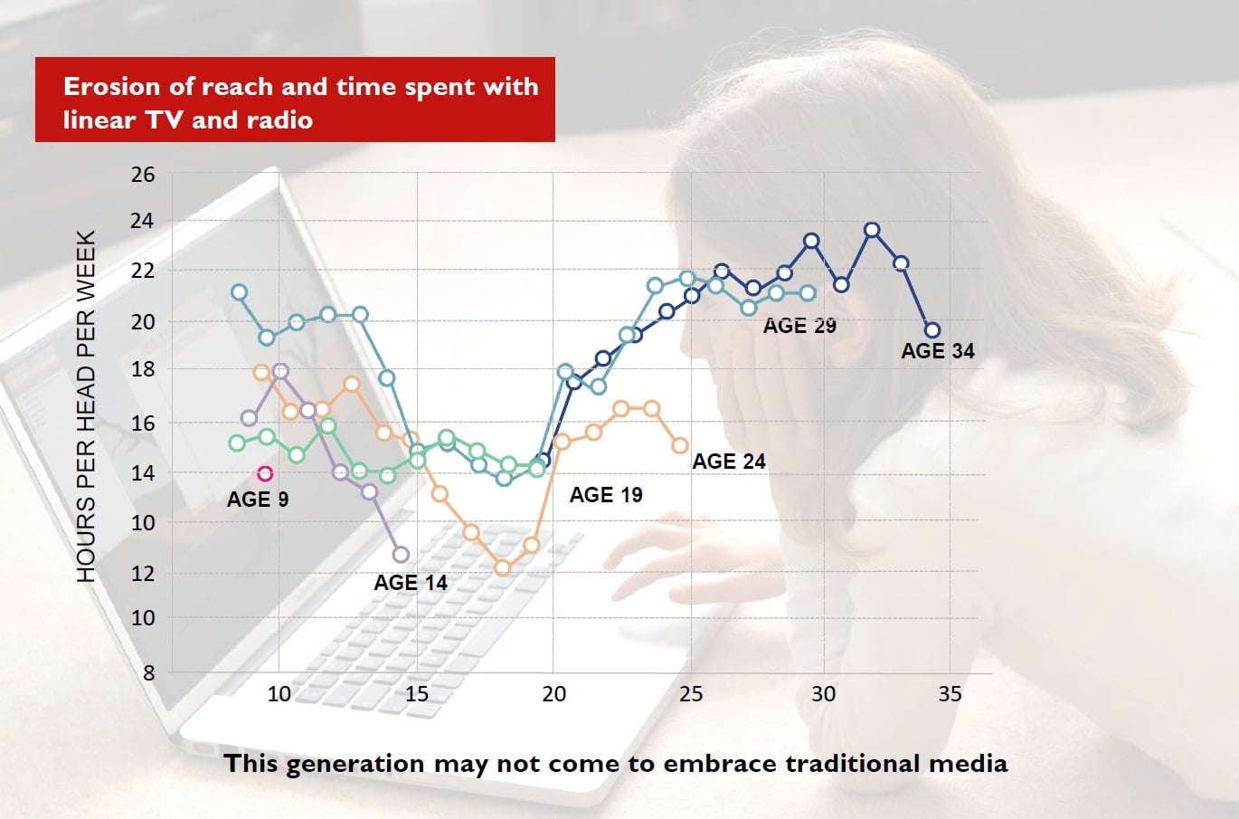 What the BBC study shows is that older generations got back to after a while to linear consumption (blue curves “age 29” and “age 34”). They started with linear radio and TV until they were 14-15, and slowly got back to normal linear consumption around 25.