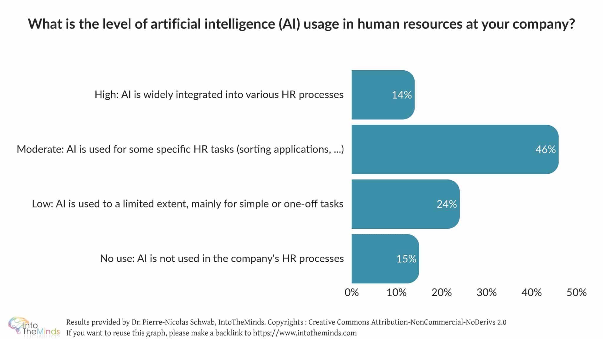 The results show that, quite logically, the majority of companies do not yet use AI intensively in their HR processes. The majority of companies (46%) use AI at a moderate level, for example, for sorting applications. Only 14% of companies we surveyed have fully integrated AI into their HR processes. At the opposite end, 24% use it minimally, and 15% do not use it at all.