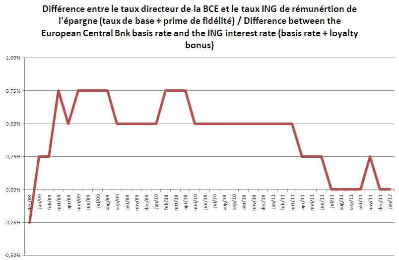 I also calculated the difference between the ECB rate and the ING interest rates (basis rate + loyalty bonus). What you can see on the graph below is that ING started in March 2011 narrowing down the difference between its rates and that of the ECB. As of today there is no difference and the price ING pays you for your money is the same it pays to the ECB.