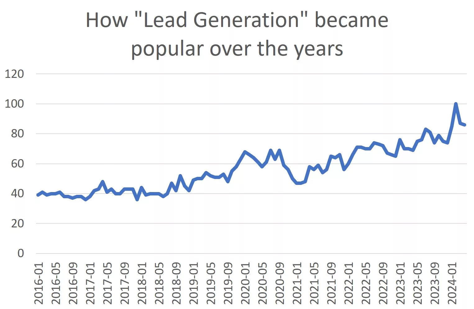 The popularity of the term “lead generation” is relatively recent. According to Google Trends, it was only at the beginning of 2021 that the popularity of this term began to increase. Based on the graph below, we can roughly say that searches on “lead generation” are 2 times more numerous in 2024 than before 2019. In 5 years, interest in lead generation has doubled.