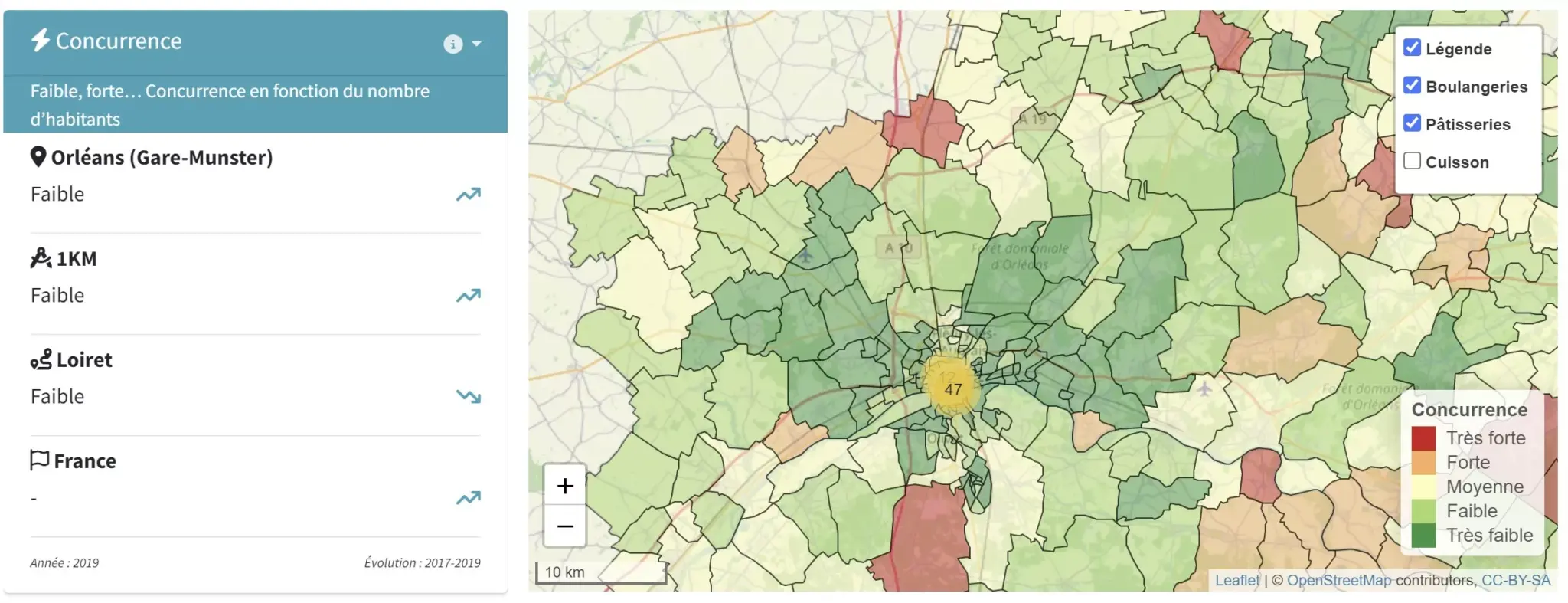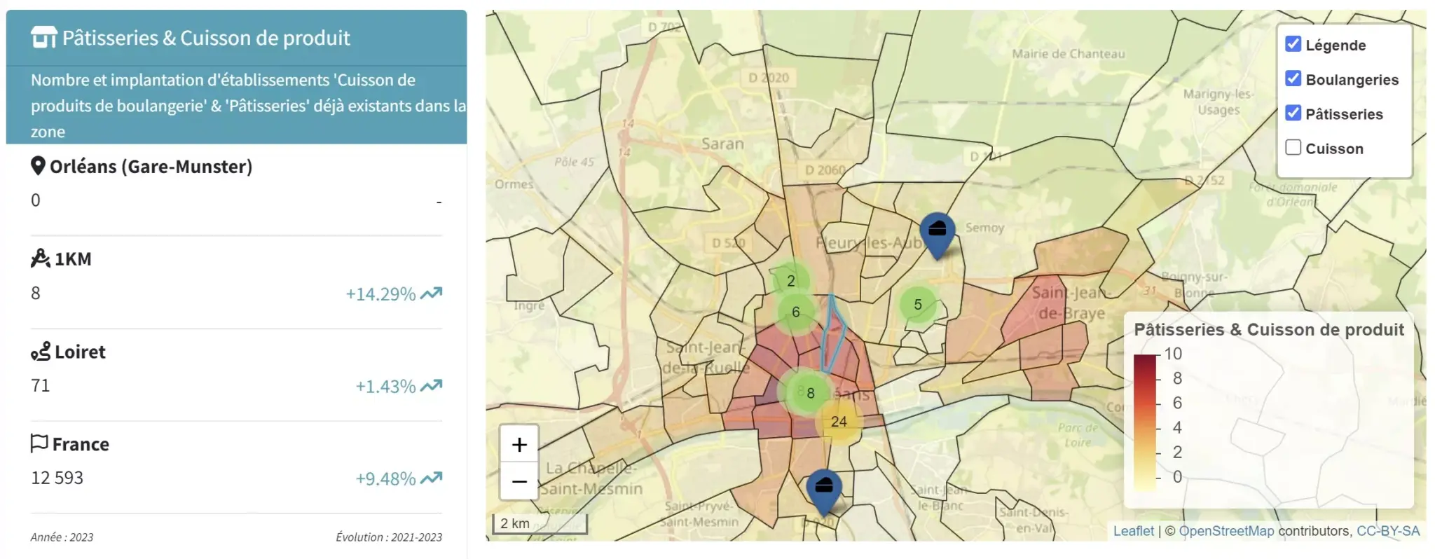 Direct competitors are the companies that do the same business as you. In the third tab, you can put concrete figures on the competition. This is extremely useful, and the map is very well designed. The figures displayed are recent (2023), and the evolution is measured at a neighborhood, catchment area, regional and national level.