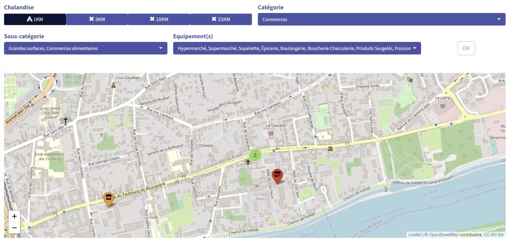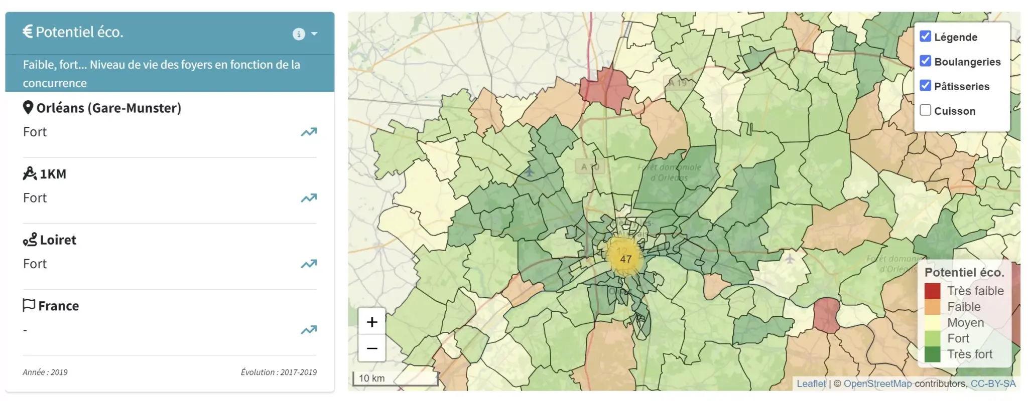 The first step is remarkably simple: you choose a profession from among the 96 represented by U2P and a location. In the example below, I’ve chosen the profession of “baker” in Orleans (a city in central France). It is also possible to vary the analysis by modifying the distance or travel time of the catchment area. This is especially useful but would have required some explanation in the tool. The catchment area is different in the city than in the country. It would have been nice to pre-select a distance according to profession and location.