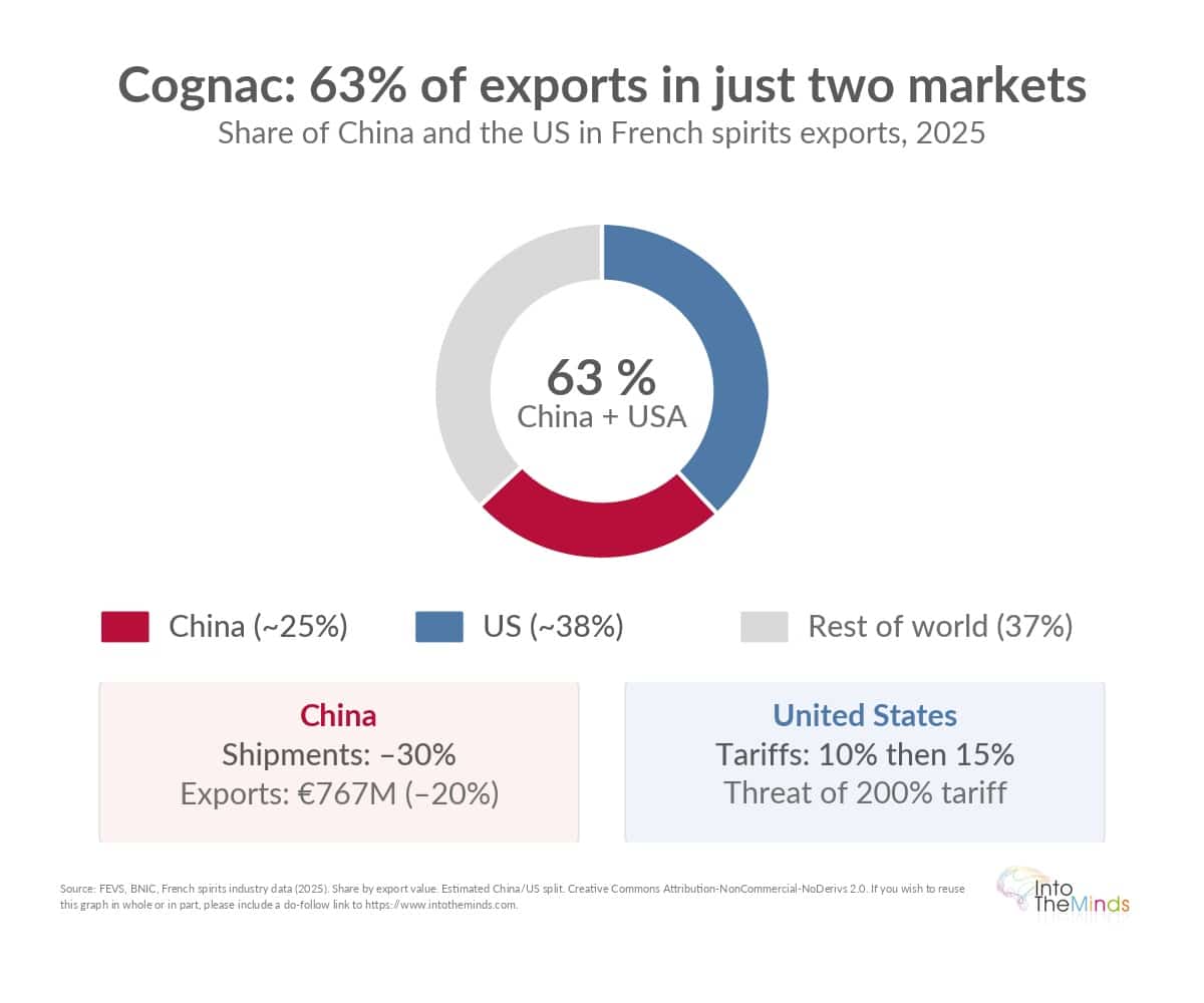 China and the United States largely dominate the cognac market, accounting for 63% of exported sales of the French spirits industry in 2025. These two markets largely determine sector performance, creating both significant opportunities and risks linked to geographic concentration.