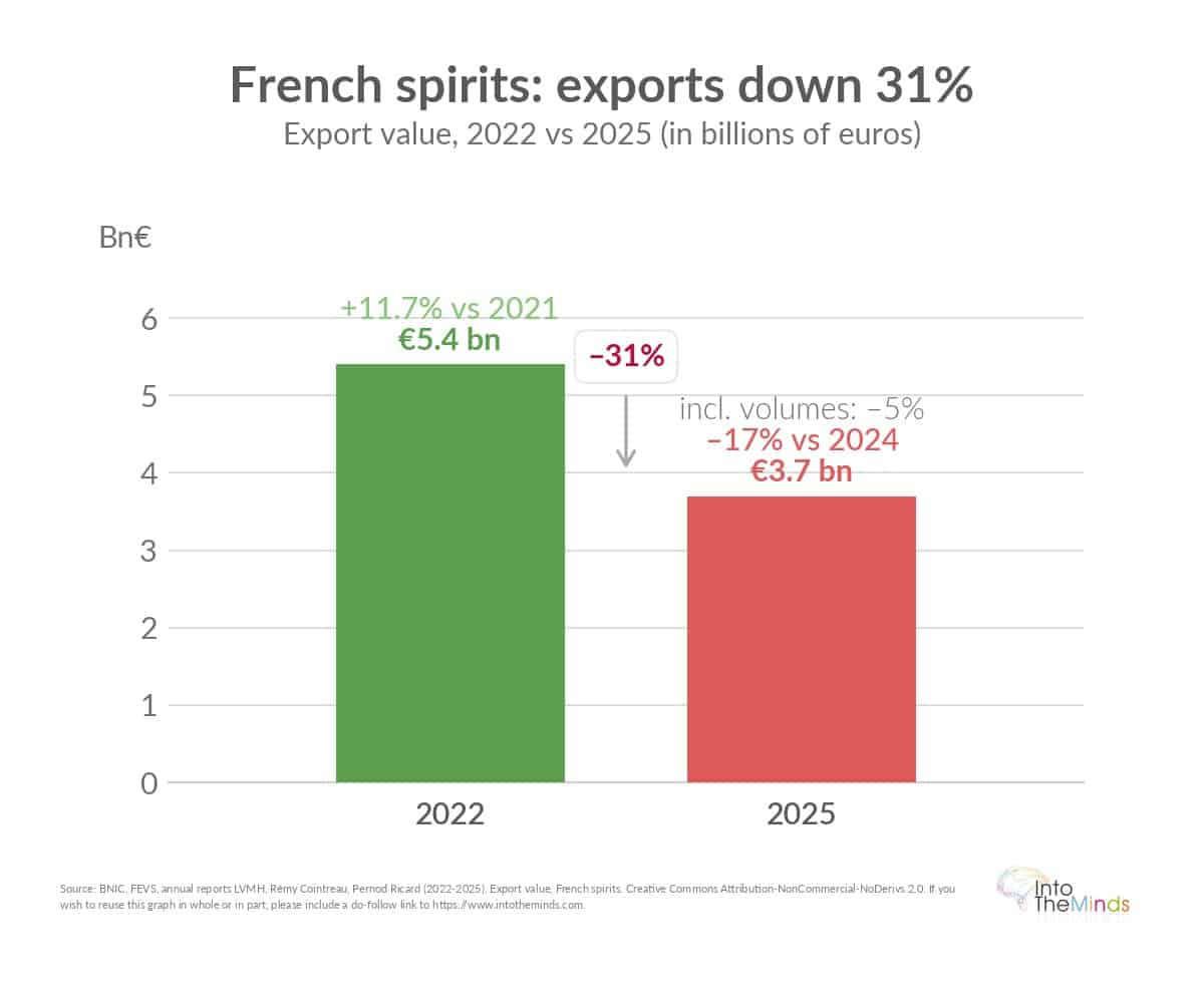 This situation deteriorated significantly from 2024 onwards. In 2025, the value of French spirits exports fell to €3.7 billion, a decrease of 17% compared to 2024 and 31% compared to 2022 (see chart below). Volumes also declined by 5%, particularly affecting French wine-based spirits.