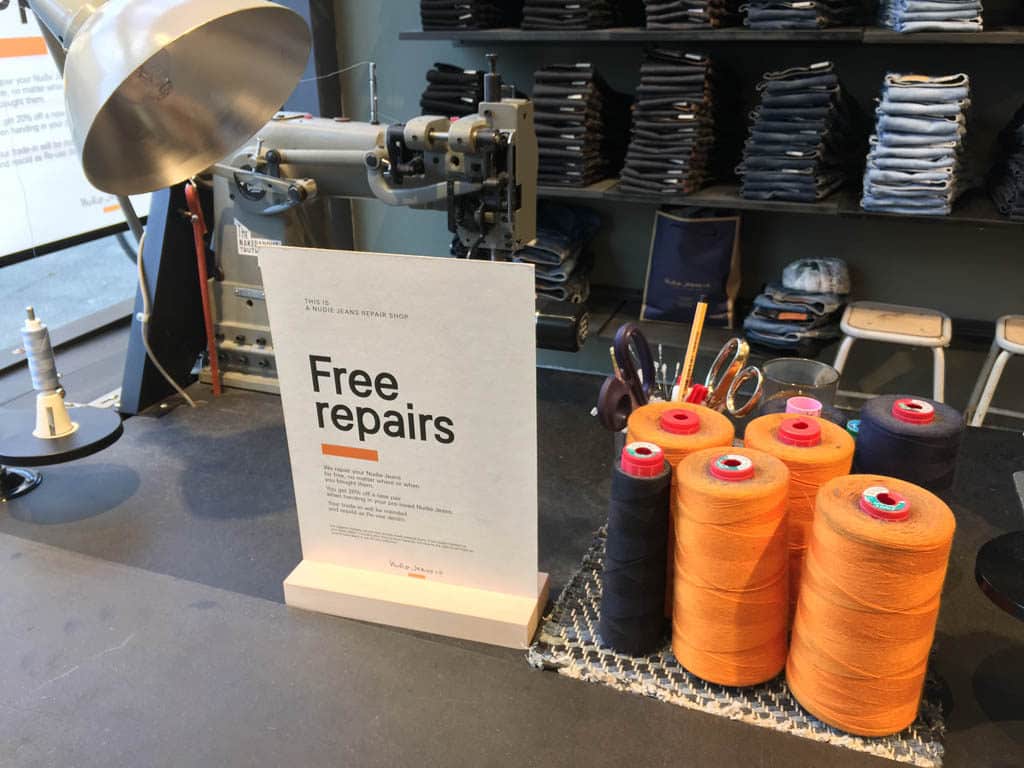 The ecological and socially responsible branding of Nudie Jeans translates into a very interesting customer experience in the store.