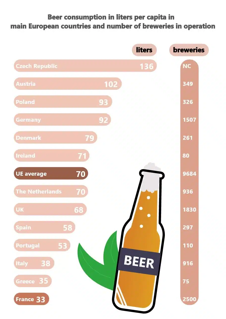 There are considerable differences. In France, the average consumption is 33 liters a year, while in the Czech Republic, it’s 136 liters. But it’s in France that there are the most breweries (2,500!), 8 times more than in Poland, even though average consumption in this country is three times that of France.
