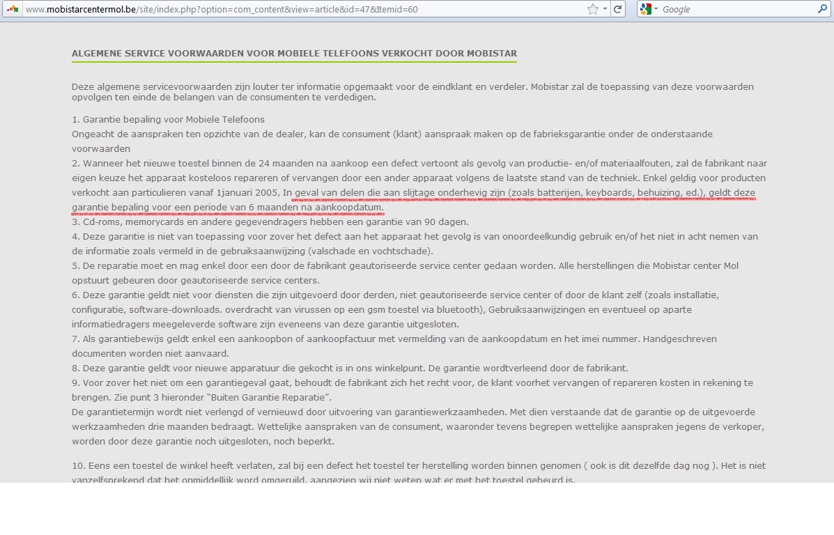 Mobistar should actually thank me because I helped the company correct this lack of knowledge. I taught employees where they could find the terms and conditions and, more importantly, where they could read that the 2-year warranty applies. Believe it or not employees are prompt to tell you that the warranty is only 6 months per the terms and conditions but they don’t know where to find those very T&C and have never read them. When I first handed them over their own T&C and pointed at section 4.2 you can guess they had a hard time. For you information the T&C are printed on the back of each invoice. Be warned.