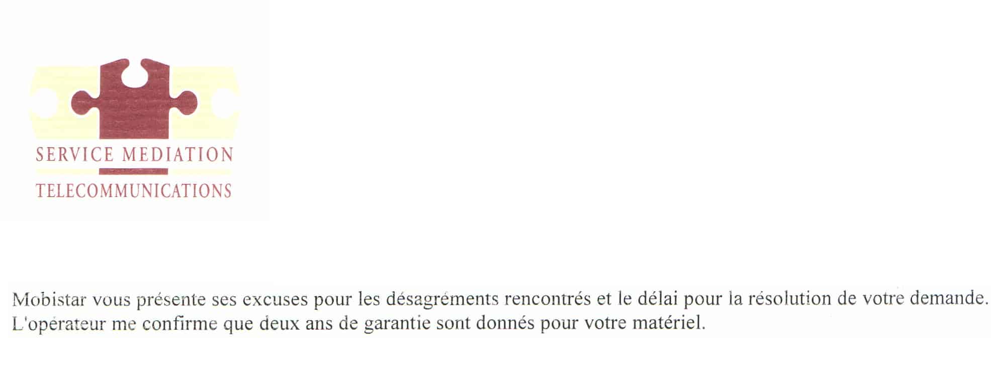 Mobistar kept denying my rights and although I sent them complaints by registered mail (which never got answered by the way) and although I went in person to complain at their headquarters, I was eventually forced to start a procedure against them. At the end of this procedure, which was managed by the Office of the Ombudsman for telecommunications, Mobistar eventually recognized in writing that they were wrong and that a 2-year warranty does apply.