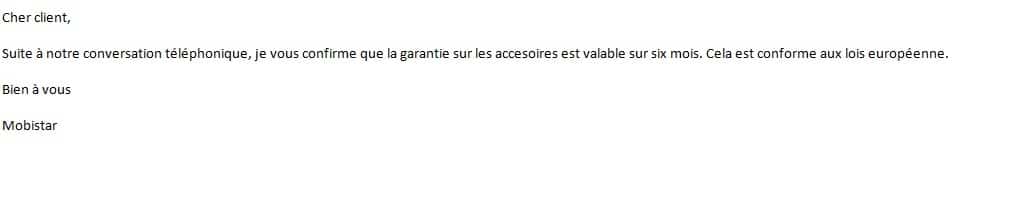 per our phone call I’m herewith confirming you that the warranty on [cell phone] accessories is 6 months. This complies with European laws”