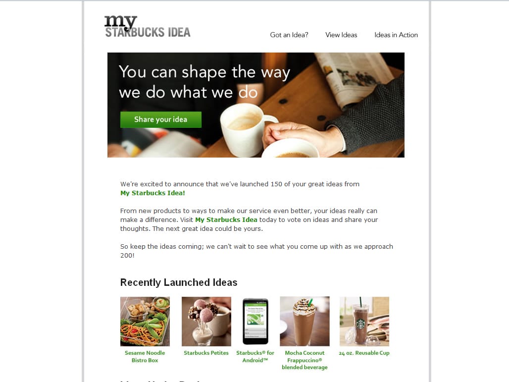 « Great » and « failure » may be two words you wouldn’t associate at first. Yet, it’s the impression which I got whe I recently received the Starbucks newsletter proudly announcing that 150 ideas from the MyStarbucksIdea platform had been implemented. 150 ideas is a lot. Yet it is nothing compared to the 116100 ideas submitted (I summed them up on August, 12th). It’s actually a mere 0,129% of the grand total.