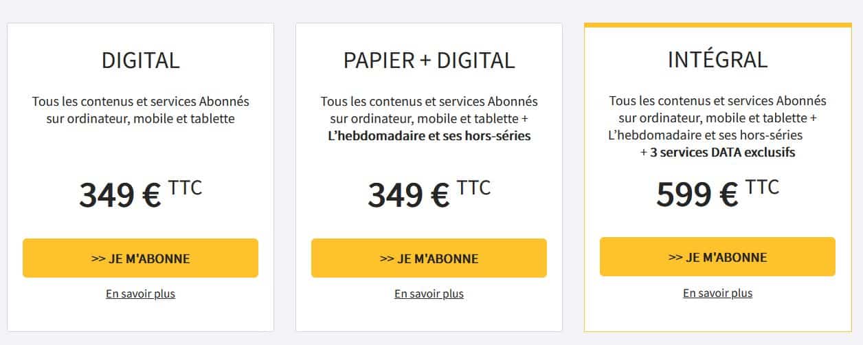 You will notice that there are only 3 subscription packages, which reduces the cognitive load and limits hesitation. Then it would help if you looked at the price differences and the calculation method (annual price per month). The middle option offers more for a minimal difference. This is the one that the publisher wants to “push” and towards which he wants to orient the choice of the visitors unconsciously.