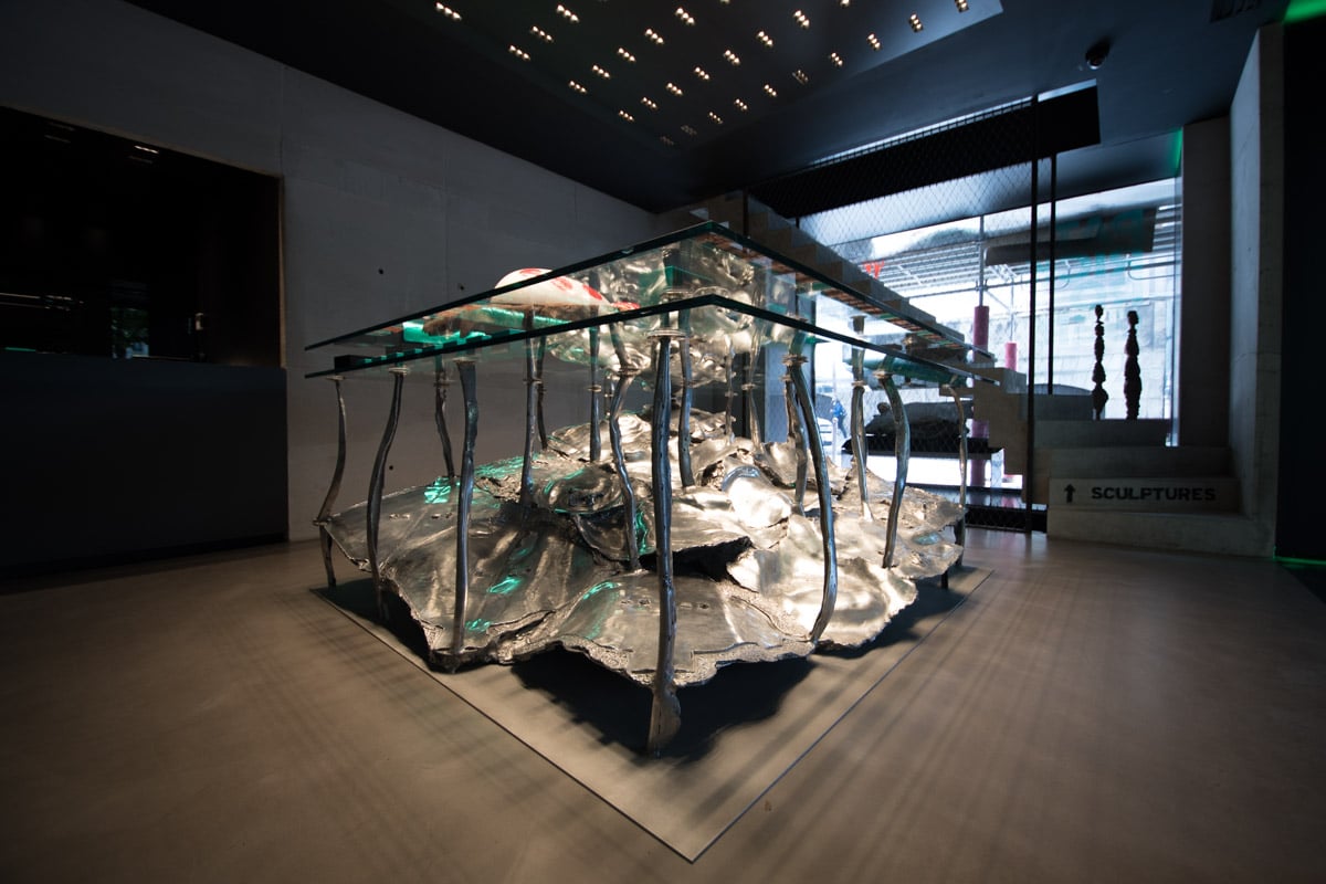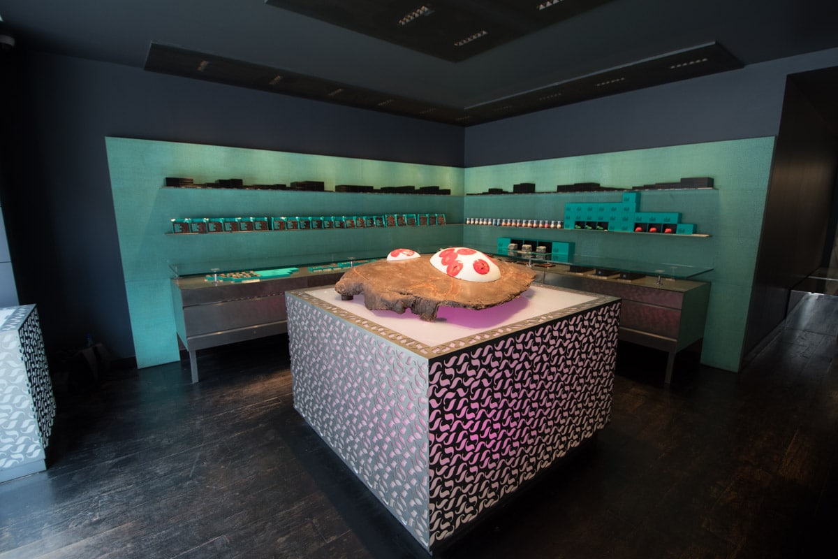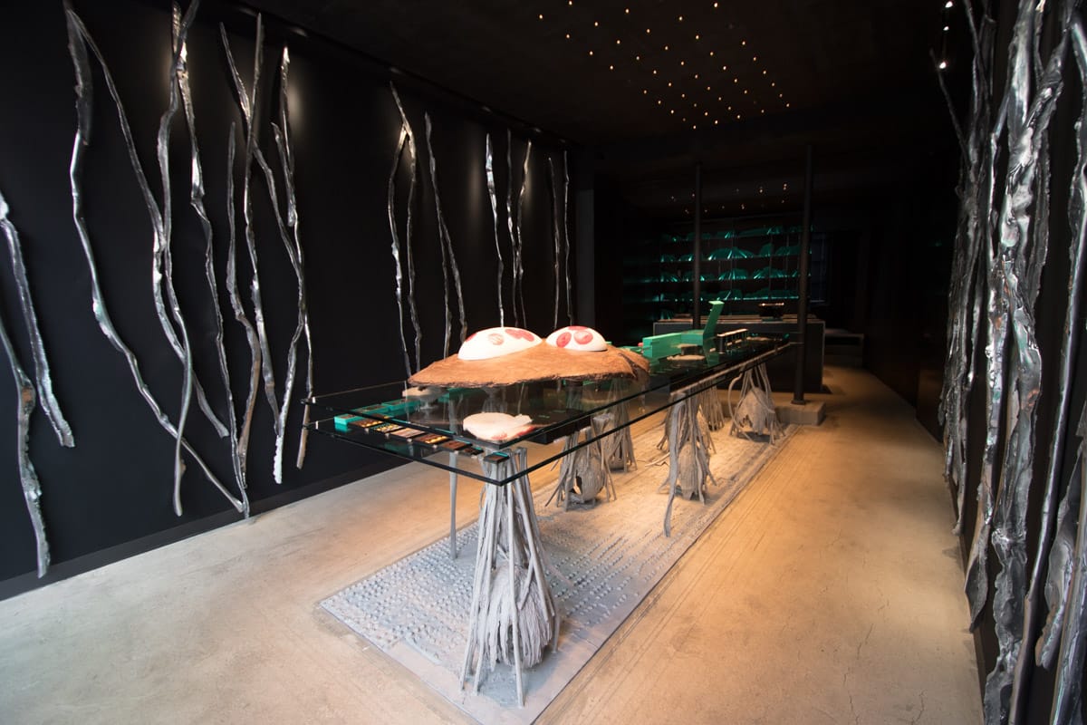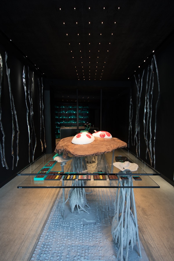 Patrick Roger was inspired for this sales outlet by a trip to Madagascar. Metal sheets run along the walls, and a strange structure supports the central glass shelf. Each “foot” seems composed of a giant fruit trapped in a tangle of vines. When you look closely at this structure, you discover the details, including hundreds of small monkeys emerging from the ground. The effect is seizing.